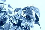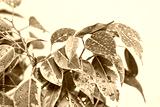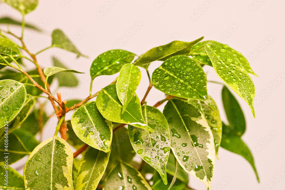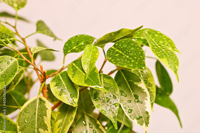 Ficus benjamin plant leaves in drops of water after spraying, in a pot on a light background close-up. Soft selective focus. Indoor plant for indoor floriculture and phytodesign.
