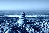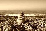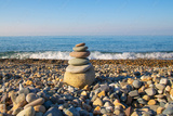 the concept of balance and harmony. stones on the beach in nature. A pyramid of stones on a beach of pebbles, in the background a blurred background of the sea and sky at dawn