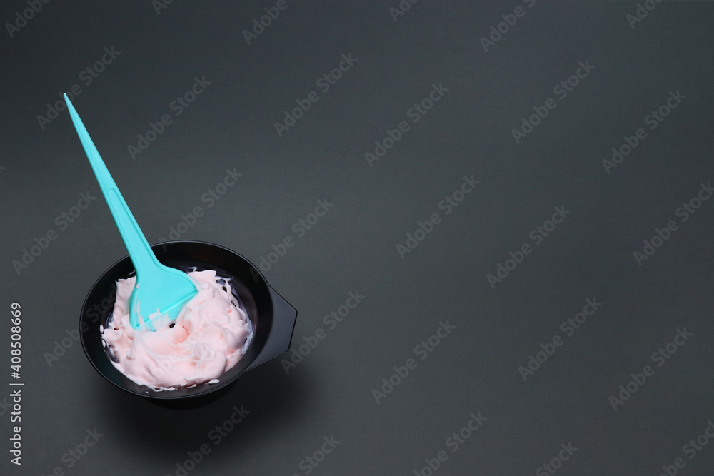 hair dye with a brush in a bowl on a gray background
