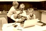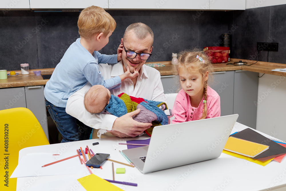 Father with a newborn baby in arms working from home during quarantine and closed school. coronavirus outbreak. Young businessman freelancer works on laptop with children playing around.