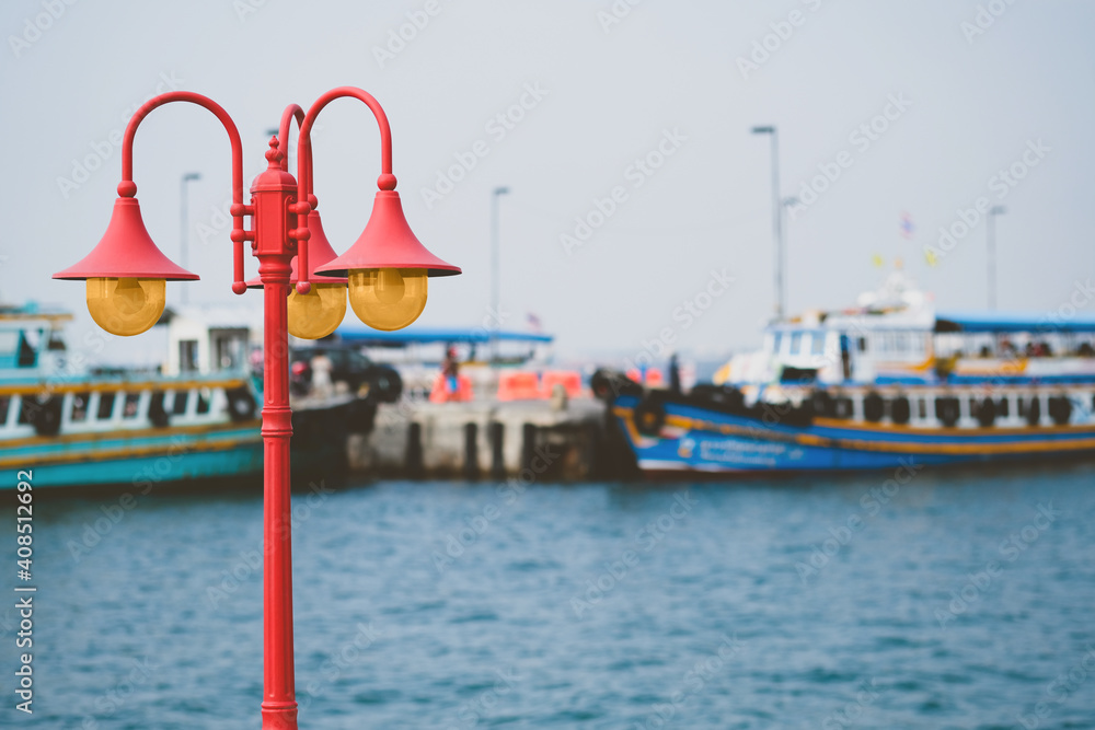 Vintage light pole stand alone on transport boats parking and ships and boats are parking in background.
