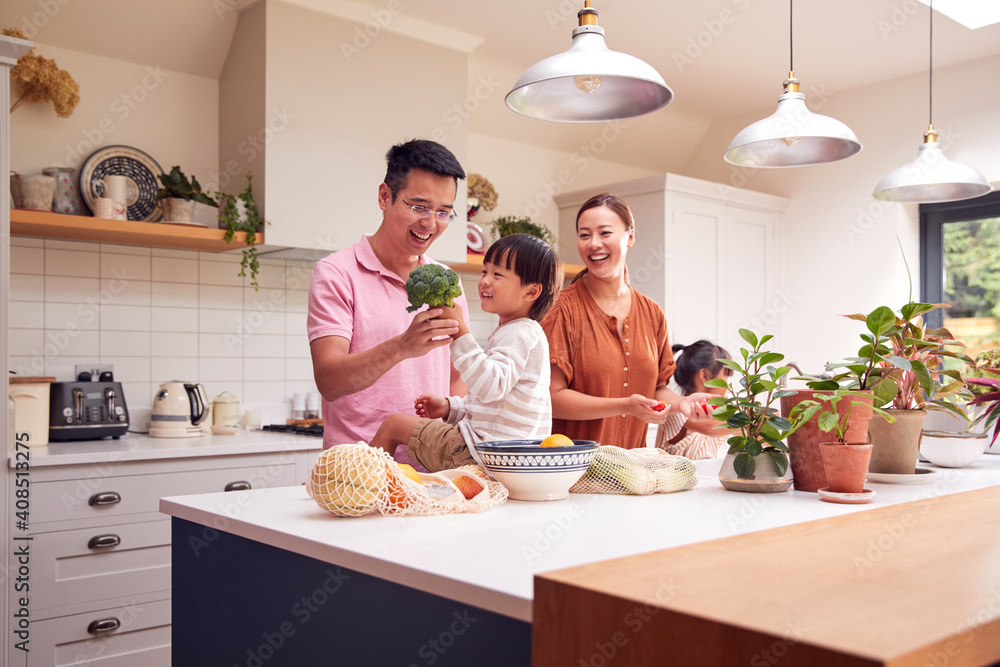 Asian Family Unpacking Local Food In Zero Waste Packaging From Bag In Kitchen At Home