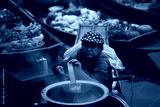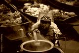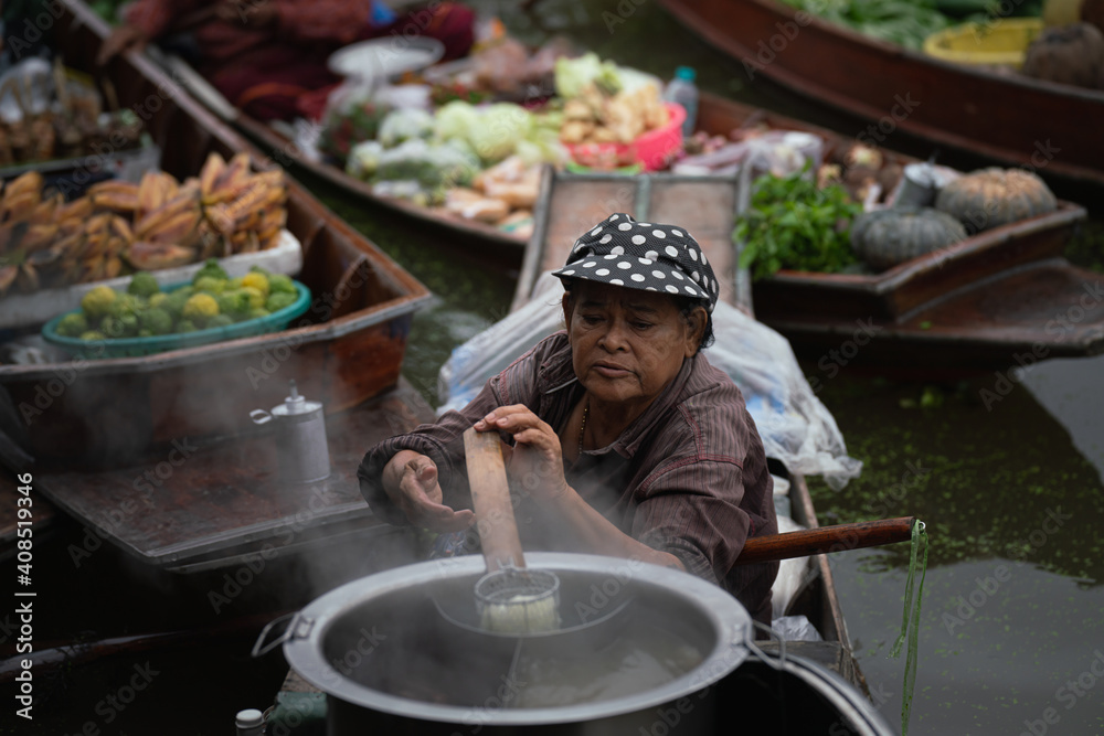 Middle age local women selling noodel on boat.Asian tourists local markets. Floating market It is famous in Thailand called Tha Kha Floating Market in Samut Sakhon Province