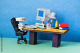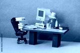 Robot office manager, retro style workplace. Old table with vintage computer, desk lamp and books. Stylish black leather office chair. Machine learning artificial intelligence concept.