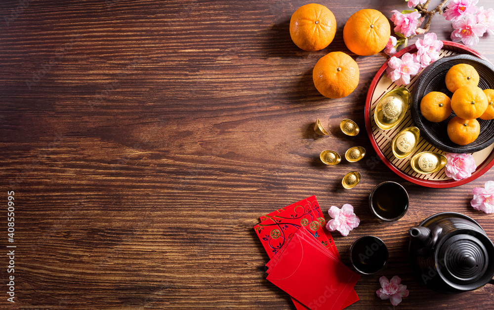 Top view for Happy Chinese new year or Lunar new year festival decorations on old wooden background. ( Chinese characters "FU" in the article meaning for fortune, good luck )