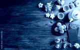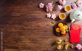 Top view for Happy Chinese new year or Lunar new year festival decorations on old wooden background. ( Chinese characters "FU" in the article meaning for fortune, good luck )