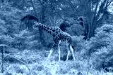 Wild Rothschild's giraffe beautiful dark male in forested natural landscape