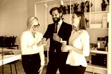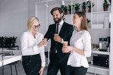 Three stylish, modern, cheerful partners during a break, talking during coffee, standing at the workplace, holding a coffee mug in their hands, man with bristles.