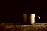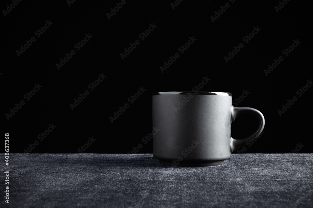 Black cup on dark surface and black background. Gloomy still life.