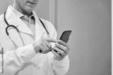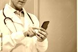 Male doctor holding smartphone in hands using mobile phone e health technology in hospital, copy space. Modern tech medical healthcare patients virtual consultation app, telehealth online appointment.