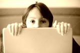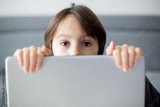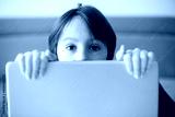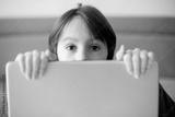 Preteen child, hiding behind notebook, online education, games and fun for kid, bad influence