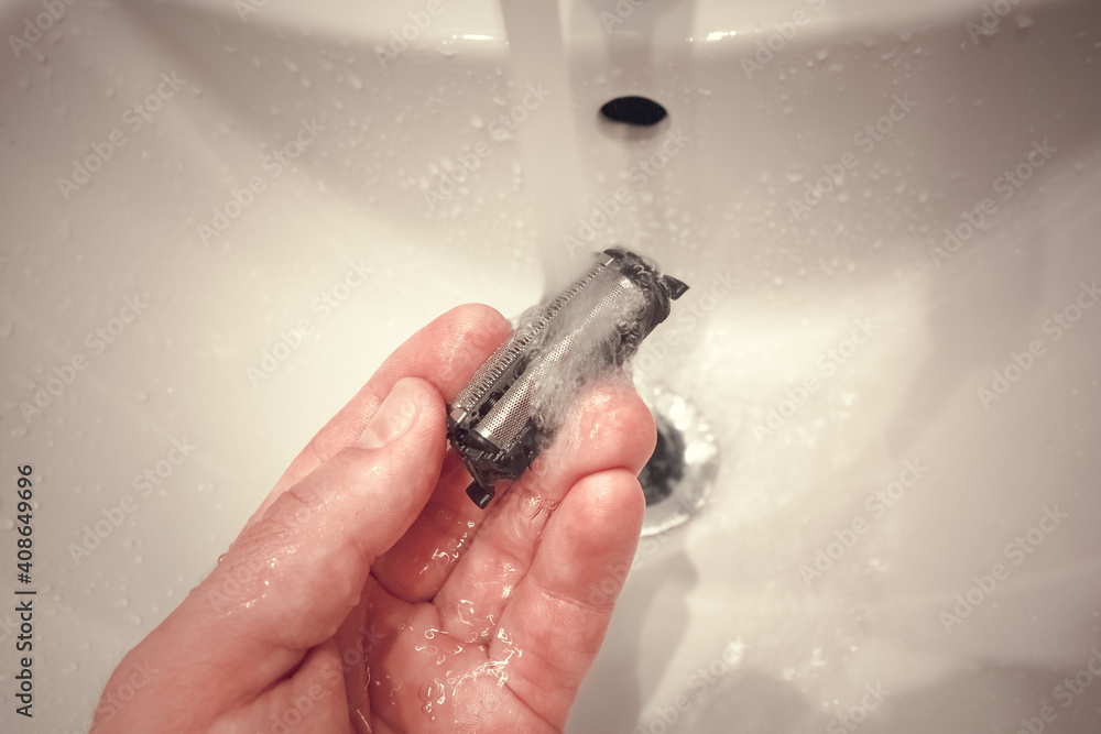 rinsing razor blades, under water in the sink. A hand with a razor head.