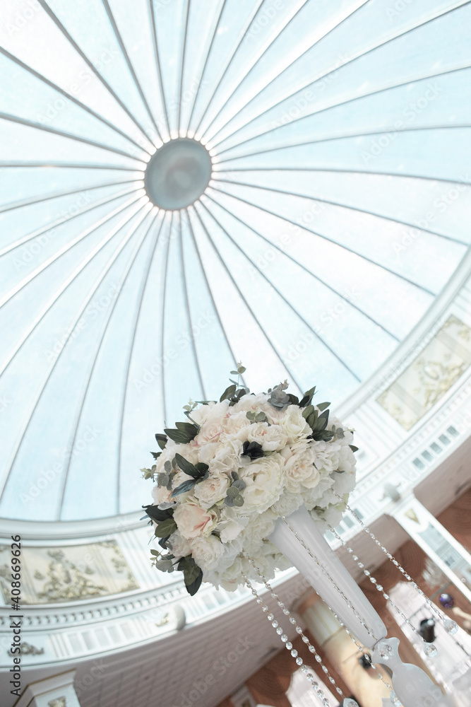 Large pink bouquet of peonies, roses and eucalyptus leaves in luxurious hall with blue glass roof in background.