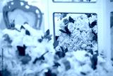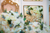 Large pink bouquet of peons, roses and eucalyptus leaves stands on dinner table in luxurious hall. Beautifully decorated in blue green colors wedding hall.