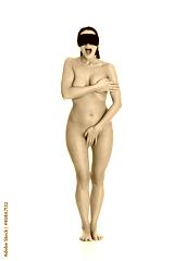 Naked blindfold woman screaming, isolated on white background