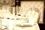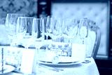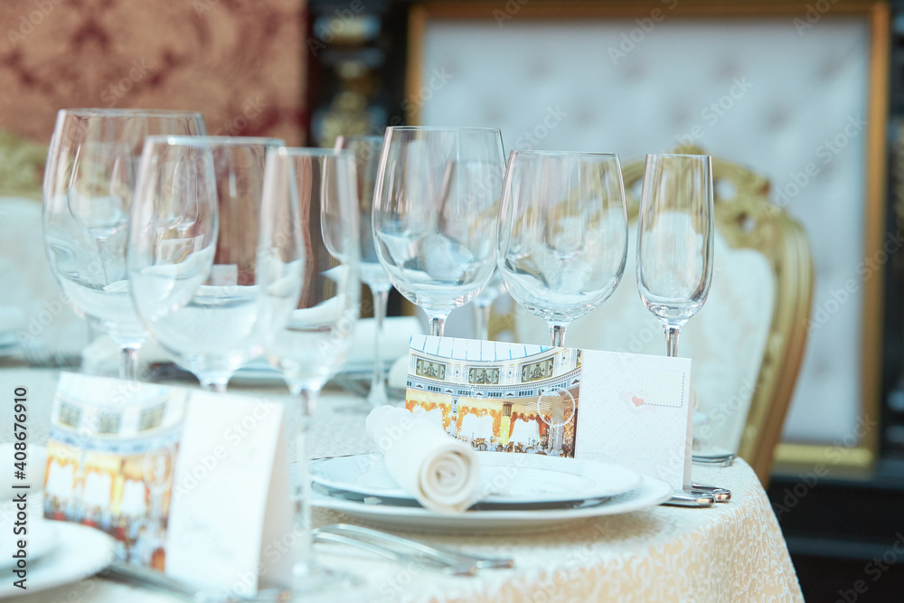 Festive table in the banquet hall are decorated with plates, glasses and cards for guests.
