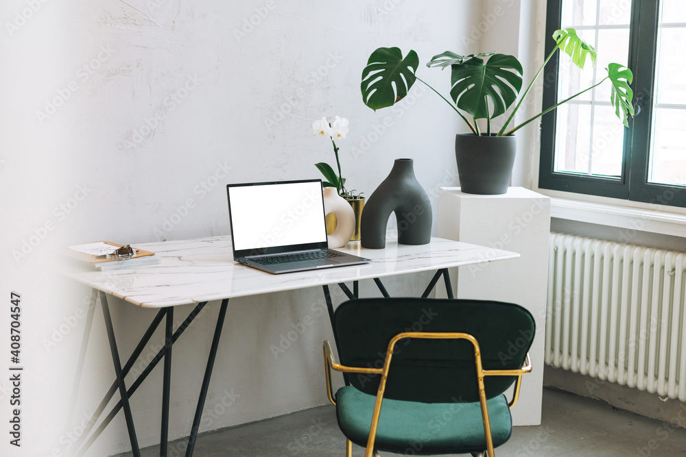 Modern workplace with an open laptop with white screen and green monstera on the marble table, mock up, template