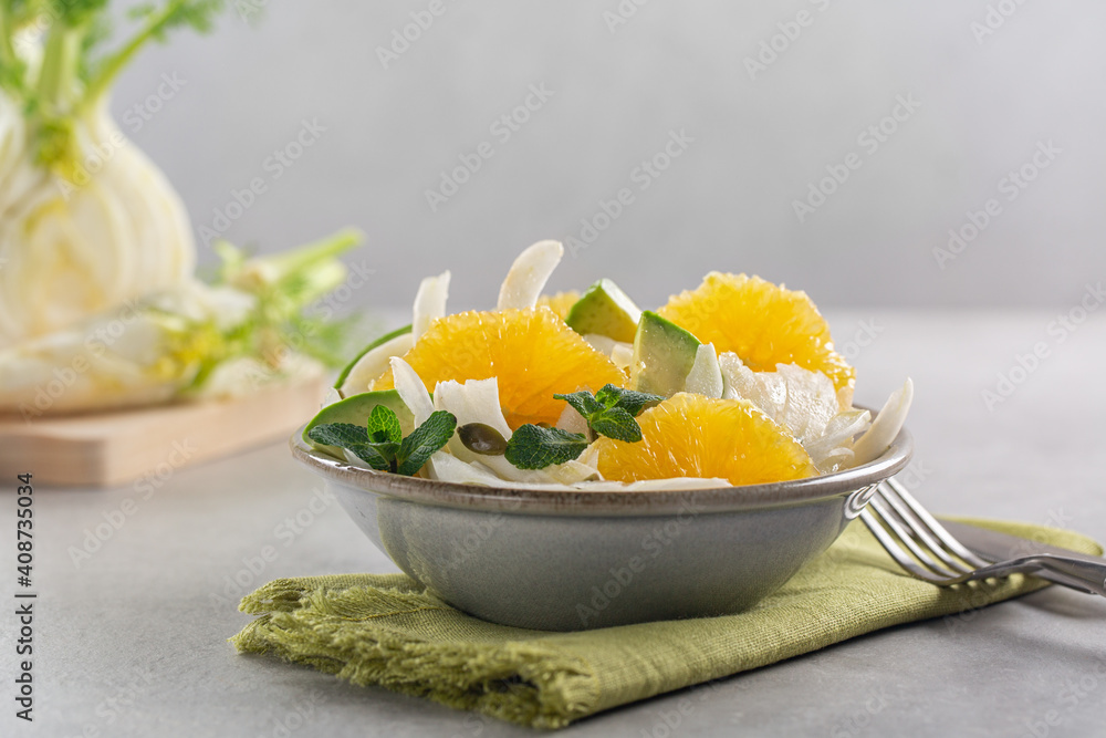 Fennel, avocado and orange salad. Whole fennel on background. Copy space.