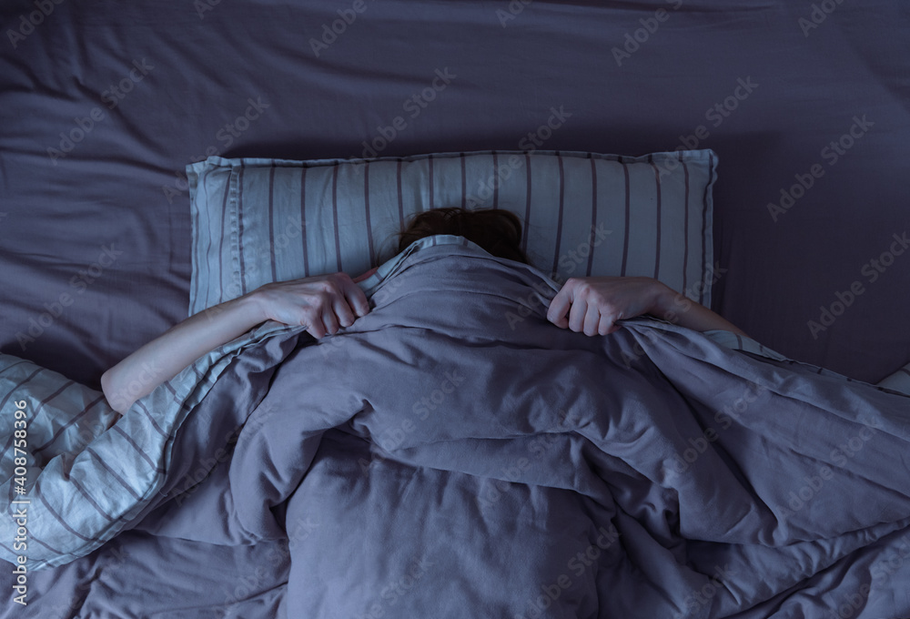 Top view of scared woman in bed covering her face with blanket.
