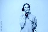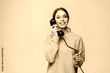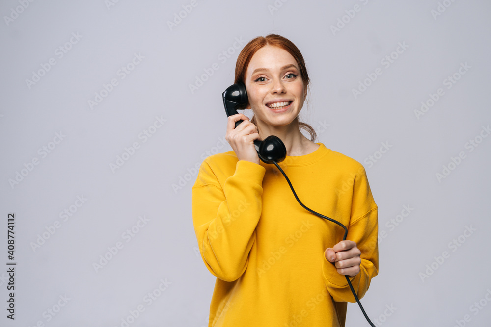 Cheerful young woman in stylish yellow sweater talking on retro phone and looking at camera against isolated white background. Pretty redhead lady model emotionally showing facial expressions.
