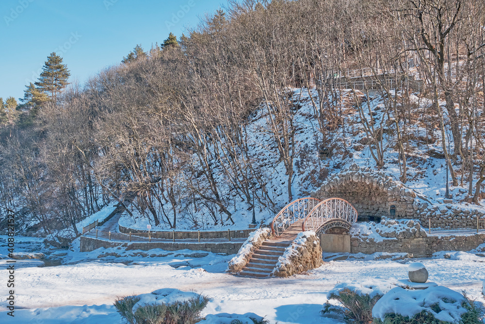 Bridge over the Olkhovka river in the national resort park of Kislovodsk, Russia