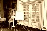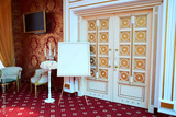 White chalkboard and bouquet of blooming peony front of wedding hall. Wedding Decoration and area.