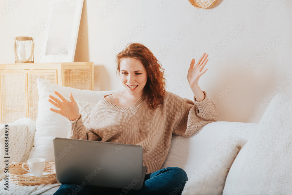 European girl with red hair in a beige sweater sitting on the couch with a laptop