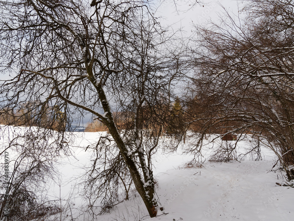 Eichener See im Winter, Grundwasserstand wasserführende See liegt in einer Mulde mit Schnee bedeckt