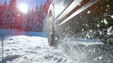 LOW ANGLE: Bright sun rays shine on car struggling to gain traction in snow.