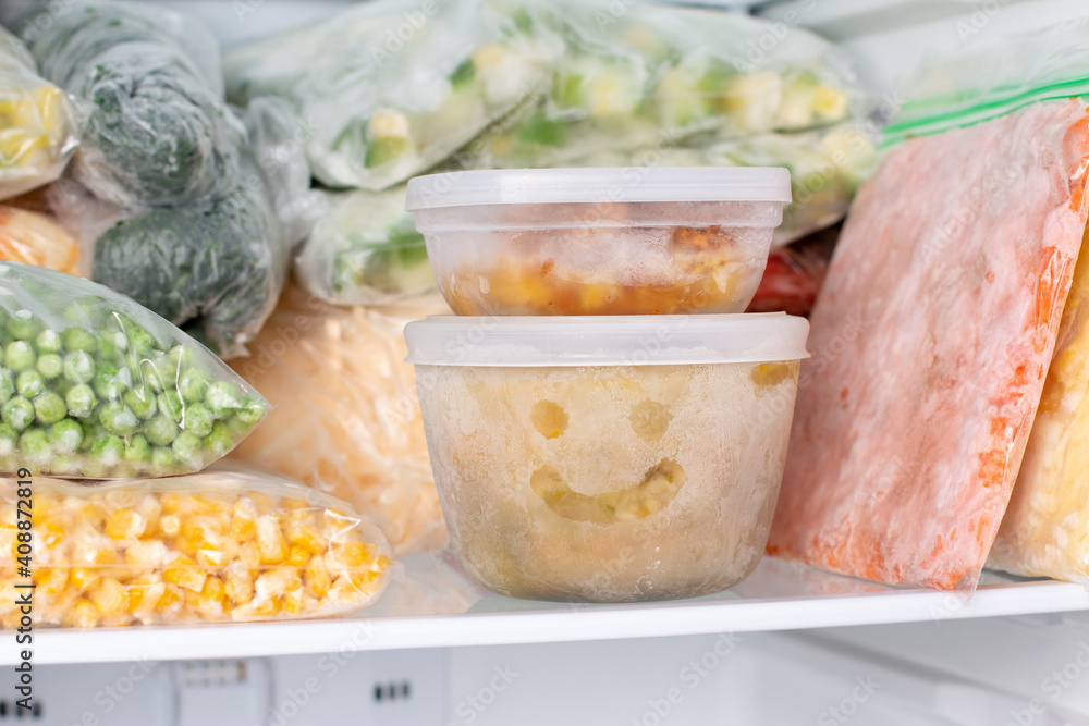 Frozen food in the freezer. Frozen soup, vegetables, ready meals in the freezer