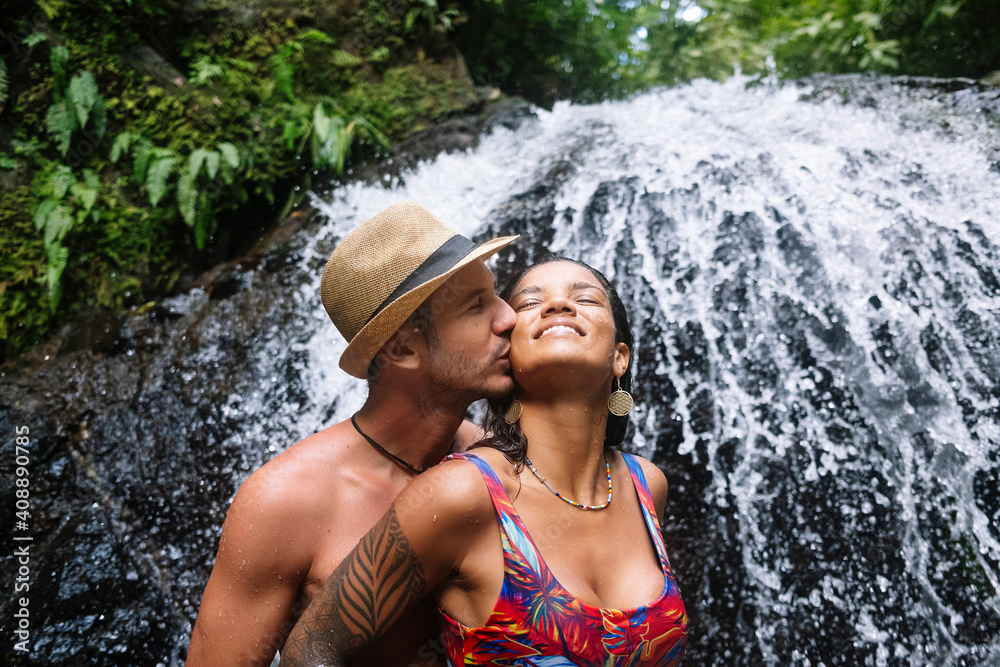 Young couple in love at the waterfall in Costa Rica