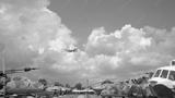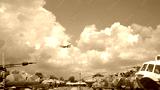 Passenger plane flying over the old planes open-air museum. Blue sky with clouds