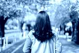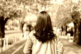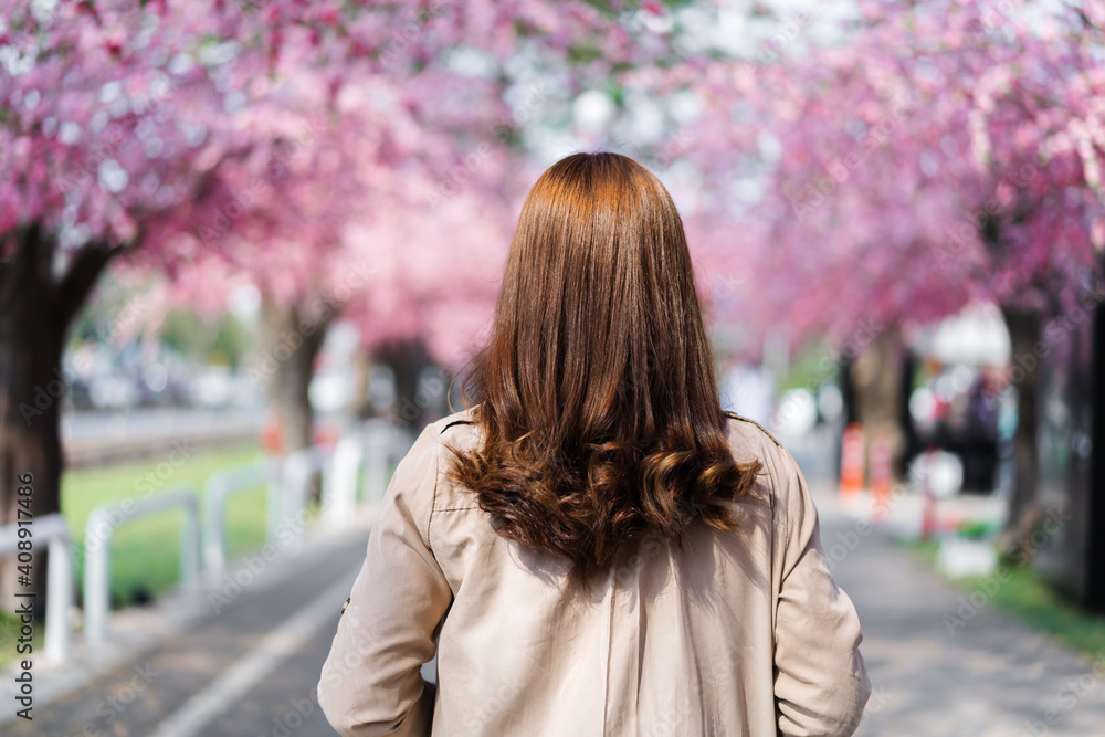 woman traveler looking cherry blossoms or sakura flower blooming in the park