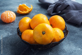 Oranges tangerines or mandarins clementines, citrus fruits on a dark background.