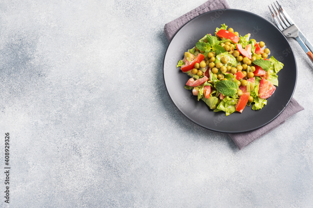 Salad of green tomato leaves and canned peas seasoned with sauce on a black plate. Spring fresh diet salad. top view copy space.