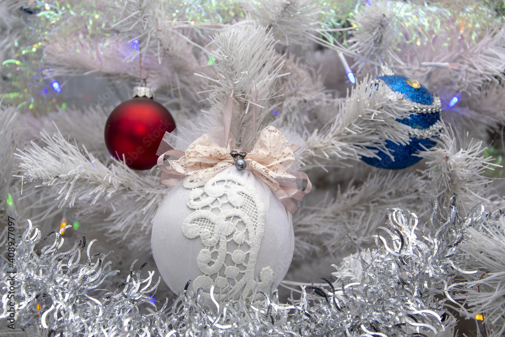 Christmas tree balls hang on the white artificial Christmas tree, holiday decorations.