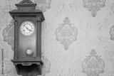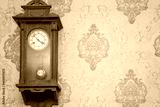 A large wooden wall clock with a pendulum hangs on the wall.