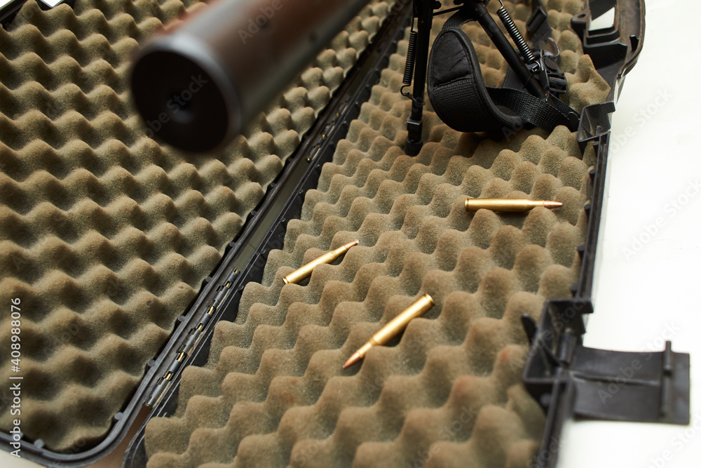Hunting rifle and ammunition on a dark background.