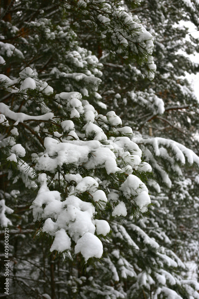Branches of winter coniferous tree covered with snow