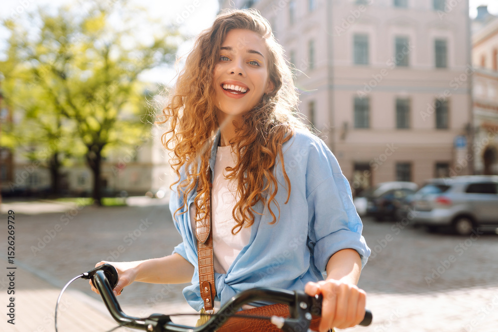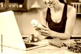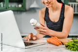 Happy young woman searching info in laptop about food supplements in the kitchen