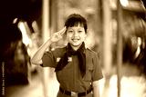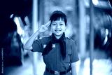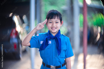 Asian uniform scout girl raise three fingers to respect with beautiful bokeh