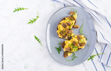 Scrambled eggs and fried mushrooms on bread. Homemade breakfast or brunch meal - scrambled eggs and mushrooms sandwiches. Top view, overhead, copy space