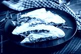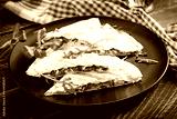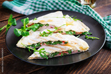 Homemade flatbread with ham, cheese and tomatoes and green herbs. Traditional flatbread.