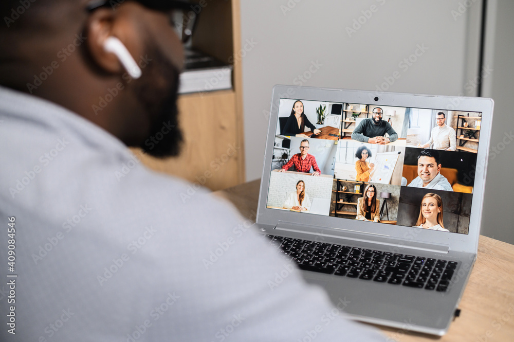 Close-up of African American man using app for distance video communication with coworkers, friends, webinar participants, meeting online in pandemic, looking at the laptop screen with people profiles