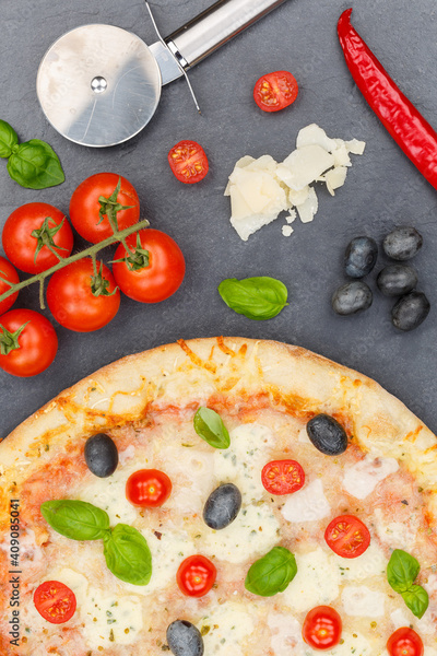 Pizza margarita margherita from above portrait format baking ingredients close up slate