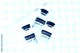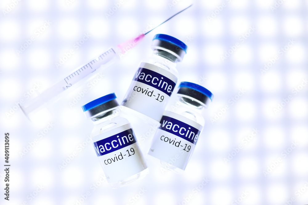 a glass medical jar with the covid-19 coronavirus vaccine on an LED background. Vaccination against coronavirus infection.