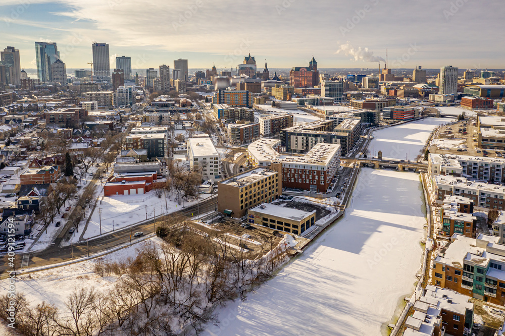 Aerial view of downtown Milwaukee WI taken during winter featuring the Milwaukee River