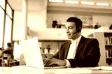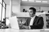 Smiling manager at the workplace, uses laptop. Handsome male hispanic employee works on project or new startup, sit at the desk in office, wearing headset, communicate with colleagues