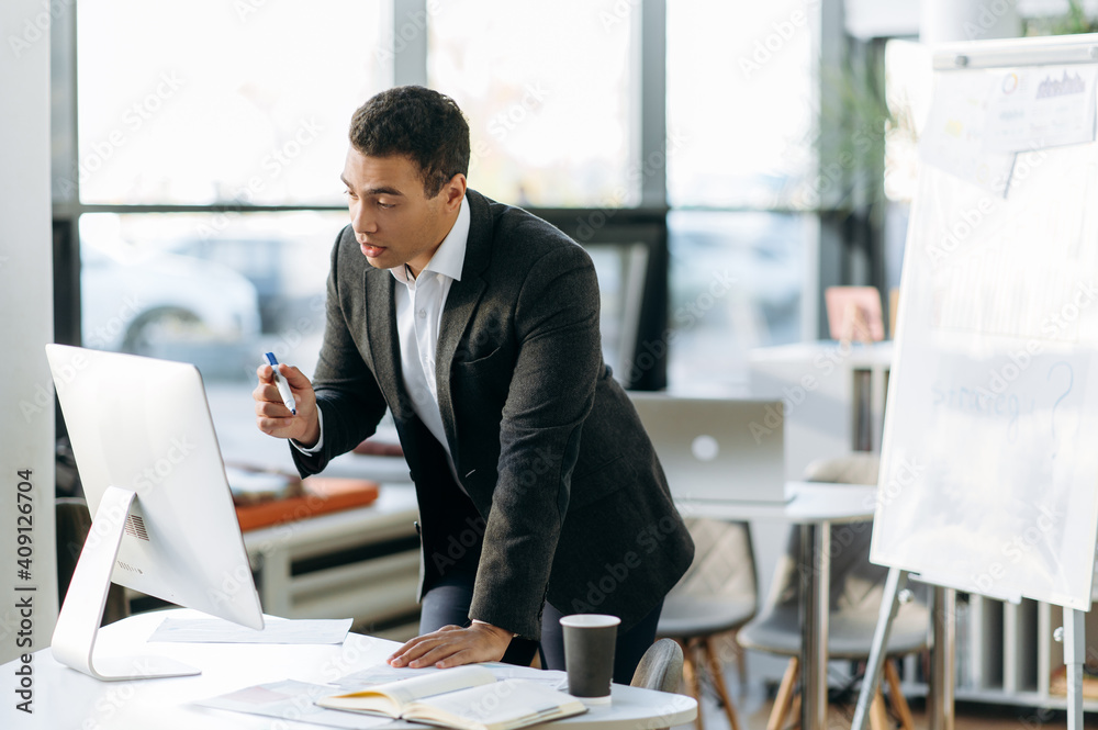 Serious businessman on video briefing, submitting work report, talking about strategy. Hispanic male employee discussing the project with colleagues at online meeting, distant work concept