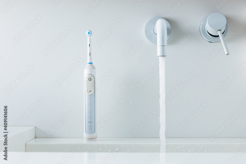 electric toothbrush on a wash-bowl, water flowing from faucet
